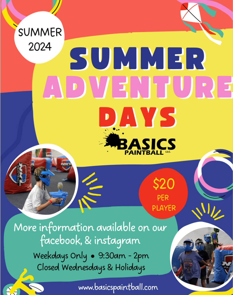 Ready to make this summer unforgettable for your kids? Join us at Basics Paintball for Summer Adventure Days! Every Monday, Tuesday, Thursday, and Friday, from 9:30am to 2:00pm, we’re turning up the excitement with a jam-packed schedule of thrilling activities. They’ll love our Gellyball Target Range, Gellyball battles, Bazooka Ball, Paintless Paintball, Cornhole, and even Bingo! Don’t miss out on the action – it’s going to be a blast! (Closed on Wednesdays.) Starts June 3rd, Price is $20 per child for the day.